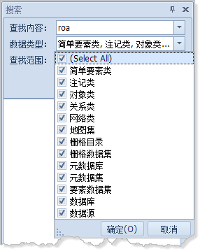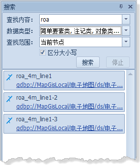 MapGIS 10中新增的“搜索”窗口可以帮助用户快速搜索地图和数据。可搜索数据源、数据库、要素数据集、要素类、要素、栅格数据、元数据等。同时,在该窗口中可以指定搜索的范围。使搜索更加精确、快捷。