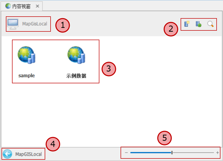 ①显示位置节点。“内容视窗”当前显示的MapGIS GDBCatalog目录节点位置;