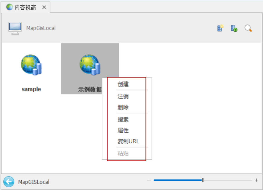 ②快捷功能按钮。在相应的MapGIS GDBCatalog目录节点上可以进行的操作的快捷按钮,例如,在MapGISLocal/MapGISLocalPlus上,有“创建”:,“附加”: