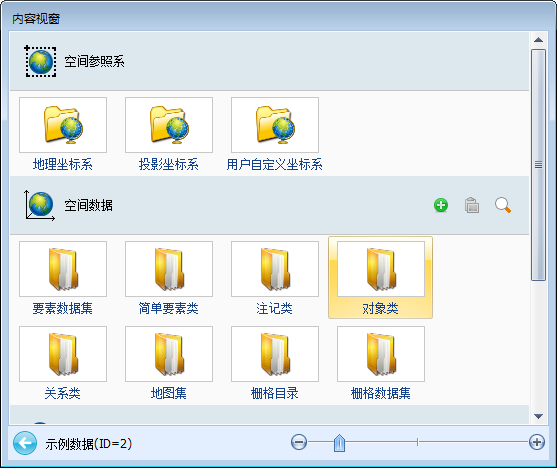 在MapGIS 10中“内容视窗”是“数据管理插件”的一个主要控件,用以实现与目录窗格联动,显示当前MapGIS GDBCatalog树节点的信息。既能够显示数据集中的文件列表,也能够显示单个数据的详细信息,并且在目录窗格中,能够对数据进行在MapGIS GDBCatalog目录下的相同操作。