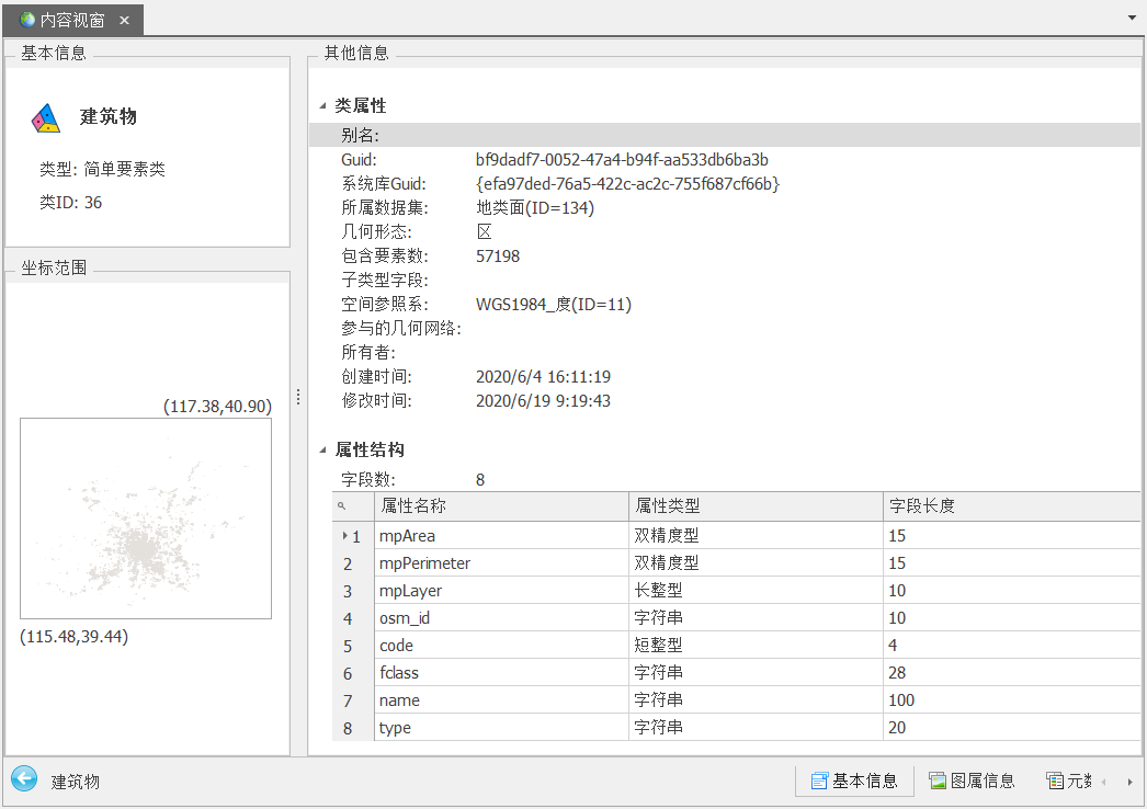 要查看要素类视图中的单个要素时,可以在MapGIS GDBCatalog目录中选择相应数据;更方便的操作即直接双击相应的要素类,即可查看单个要素的信息。在该视图中,用户可以查看要素的基本信息视图,如图所示: