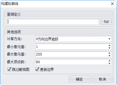 - 【查询定义】:可通过SQL语句只对符合条件的栅格进行轮廓线的重新构建。此参数为空时,对镶嵌数据集中所有栅格进行操作;