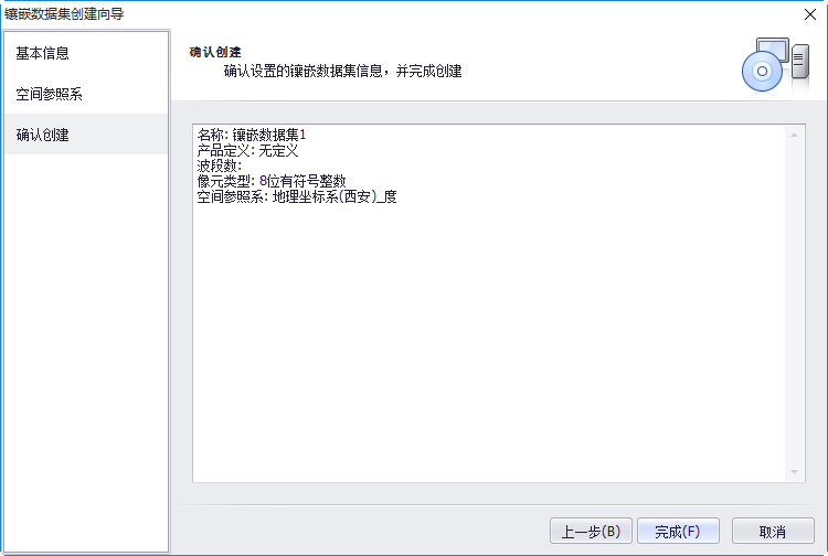 4. 确认创建信息,点击"完成",创建一个空的镶嵌数据集。