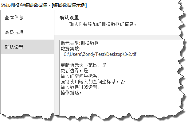 4. 点击"下一步",进行“确认设置”页面;确认完成后,点击“确认”,完成栅格数据的添加。