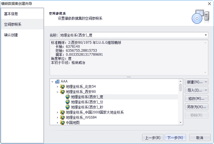 3. 设置空间参照系信息。为镶嵌数据集设置空间参照系信息,此处为必选项且参照系不能为空。结果镶嵌数据集显示时以此参照系为基准坐标,当镶嵌数据集中的栅格数据的空间参照系与此设置不一致时,均会动态投影到此参照系中显示。