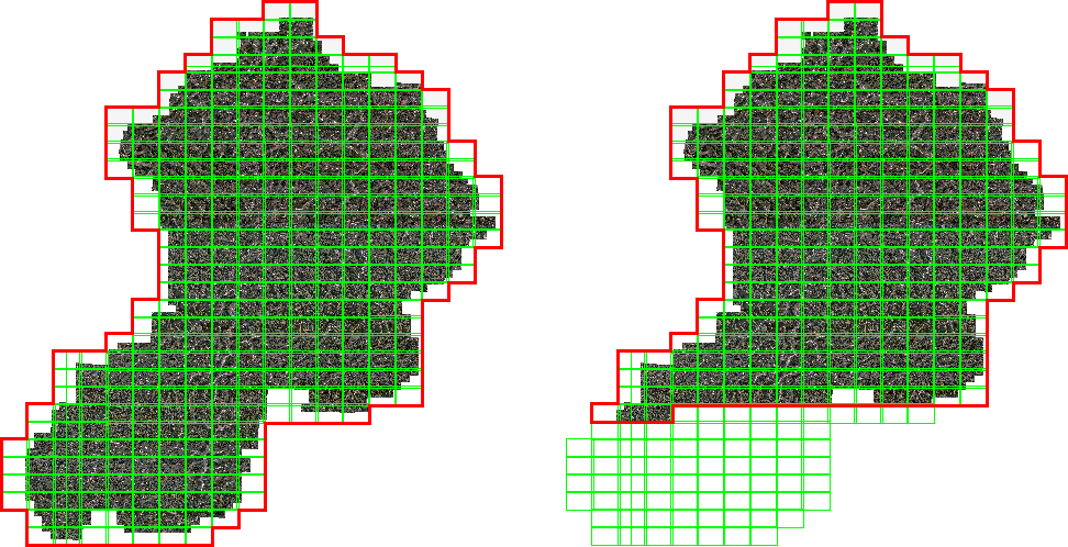 - 【追加到现有边界】:不勾选时,符合SQL条件的所有栅格外轮廓线范围即新的边界区范围;勾选时,最终的边界范围是符合SQL条件的所有栅格外轮廓线范围即新的边界区范围和原边界的并集范围。如下图示例所示,红色为边界范围,绿色为轮廓线范围。
