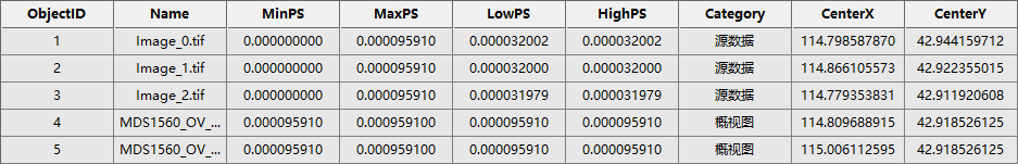 【LowPS/ HighPS】:记录了镶嵌数据集中每一个栅格项的像元大小的值,单位与镶嵌数据集的空间参照系单位一致。LowPS为真实分辨率,HighPS为使用的最高层金字塔的分辨率。若源栅格没有金字塔信息,LowPS和HighPS值一致。