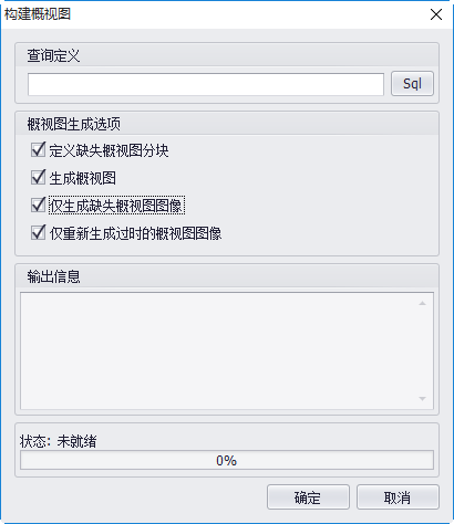- 【定义缺失概视图分块】:当镶嵌数据集的范围大于已定义的概视图范围时,勾选此项,可对缺失的范围定义概视图。当用户定义概视图后,再添加栅格时,可直接通过此功能定义新增栅格范围的概视图,而不必执行 定义概视图 操作。