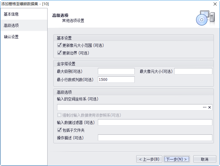 - 【最小行数或列数】:定义将在镶嵌数据集中使用的金字塔的最小行列数;