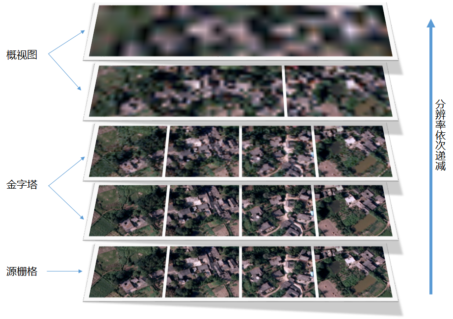 镶嵌数据集的概视图类似于栅格数据集金字塔。概视图是在镶嵌数据集的所有栅格拼接显示的效果下,按照某种规则构建不同级别分辨率的栅格副本。查看整个镶嵌数据集时,会快速显示数据的较低分辨率副本,在放大过程中则依次会显示更高分辨率副本。