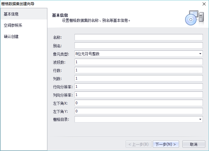 2. 填写创建栅格数据集的基本信息:名称、别名、像元类型、波段数等。若栅格数据集指定到已创建好的栅格目录下,完成栅格数据集的创建后,数据集会自动添加到对应的栅格目录下,完成基本信息的填写,单击“下一步”;