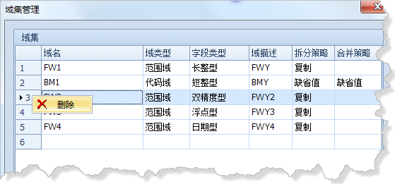 2. 单击域集表单的空白表格,可以添加一个域,并可在表格框中对新加入域的名称、字段类型、域类型进行编辑。右键选中域,可以删除该域。