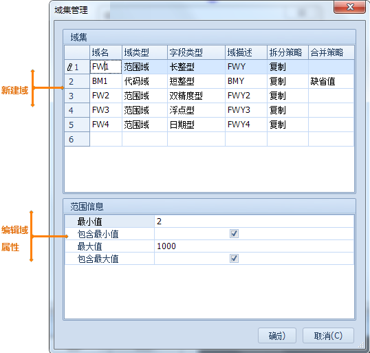 3. 在对话框的下部可以对范围域或编码域的属性进行编辑,会根据当前域集的域类型自动切换内容。