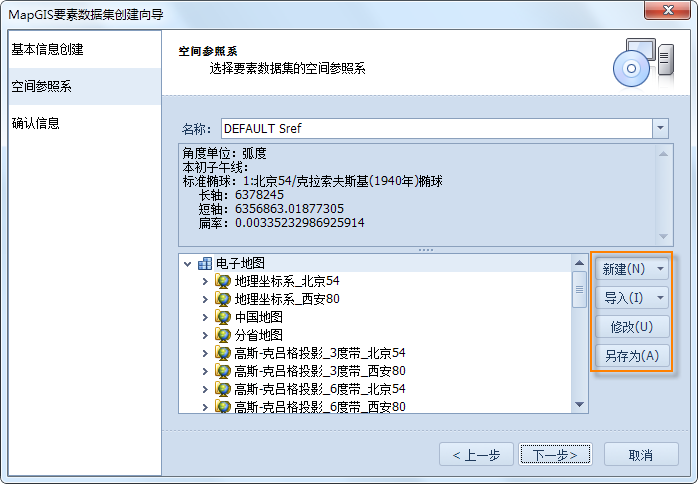 3. 空间参照系设置。在空间参照系项下列出了系统提供的所有坐标系,选择所需的坐标系。单击“下一步”;