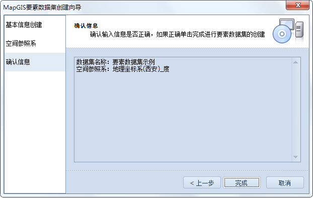 在MapGIS 10中全新的流程化创建向导中包含三个主要部分:基本信息创建空间参照系确认信息。接下来按照向导提示完成创建。