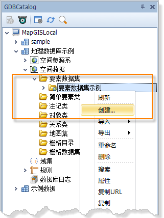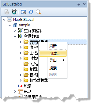 1. 在MapGIS GDBCatalog树中,右击要在其中创建各种类的要素数据集。
