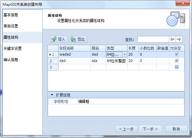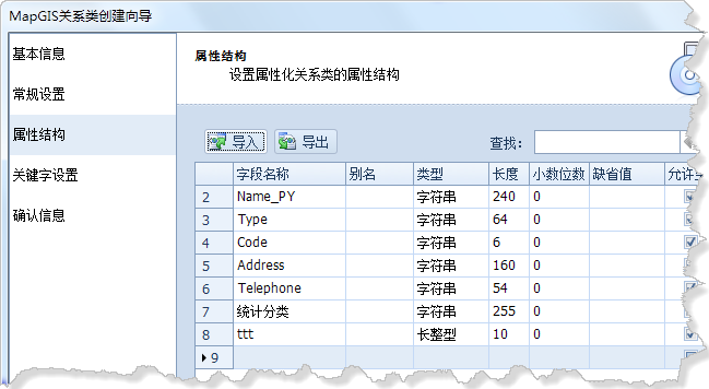 4. 属性结构设置。若在上一步骤勾选了“关系属性化”,则需要进行属性关系类属性结构设置。与创建简单要素类和对象类时的属性结构设置相同,可以在属性结构表单中手动创建属性字段,也可以通过“导入”按钮导入属性结构。完成属性结构设置,单击“下一步”。