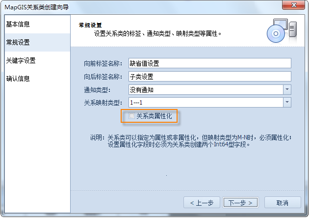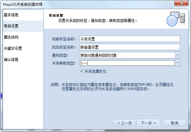3. 关系类常规属性设置。在“关系类创建向导”的“常规属性”页面上设置关系类的标签、通知类型、关系映射类型等信息。该页面上有一个“关系类属性化”选择框,可以勾选是否为关系类属性化,不勾选,单击“下一步”按钮,进入关键字设置页面;若勾选,左侧会增加“属性结构”页面,单击“下一步”进入属性结构设置。