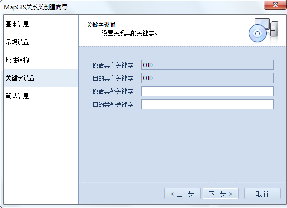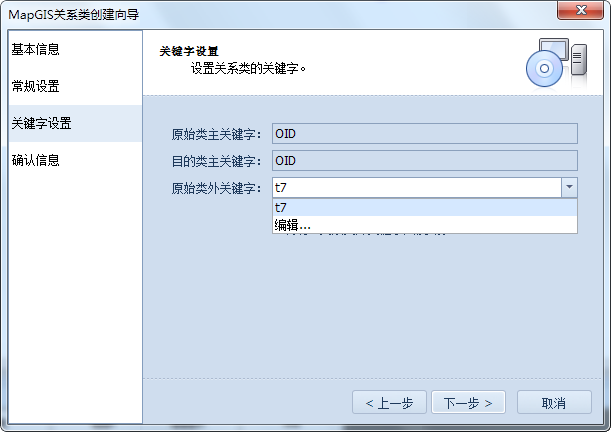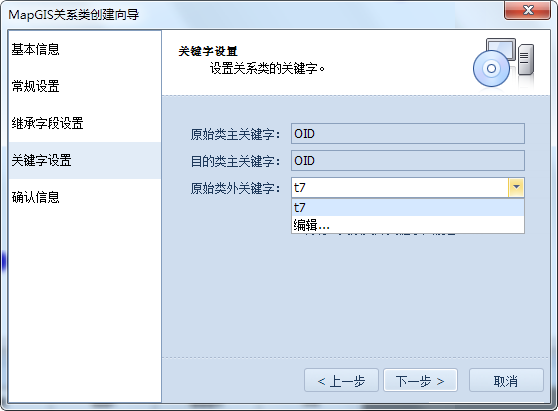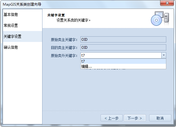 5. 关键字设置。在创建向导的“关键字设置”页面,设置原始对象类和目标对象类的主关键字,并设置原始对象的外关键字,可以通过“编辑”按钮,为原始对象添加外键关键字。完成关键字设置,单击“下一步”;