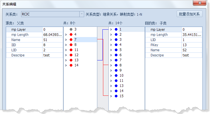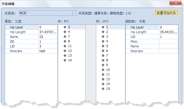 2. 用以建立目标类和原始类批量添加关系的字段已存在。在相应关系类的右键菜单中,选择“关系编辑”项,弹出关系编辑窗口,如下(以继承关系为例):