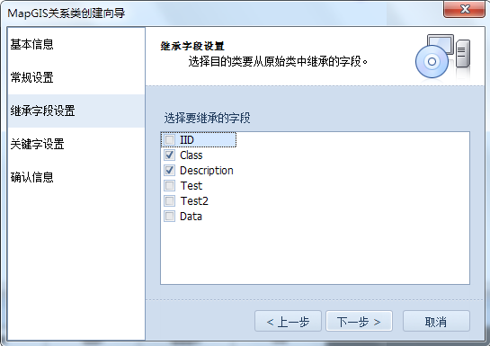 4. 继承字段设置。在来自父类的可继承字段列表中,选择需要被继承的字段。注意,在成功创建了继承关系之后,选中的继承字段会自动添加到目的数据属性表中。完成设置,单击“下一步”。