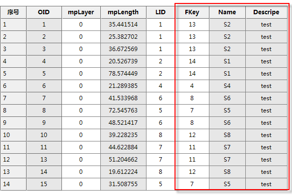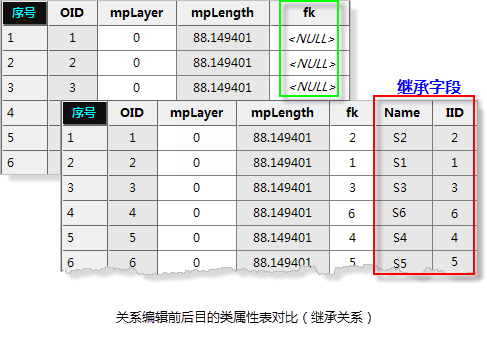 如下图为一个继承关系的目的类在批量添加了关系后的属性表。其中,FKey为原始类外键,添加关系后,FKey中的值对应原始类中的OID值;Name和Descripe项为目的类继承原始类的字段,其值对应原始类中的相应值。