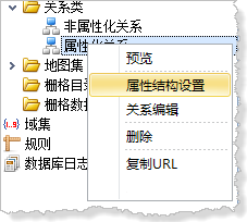 若在创建关系类时,使用了关系类属性化(即编辑了关系类的属性结构)操作,那么在对应建立起来的关系类右键菜单中则会有“属性结构设置”项。