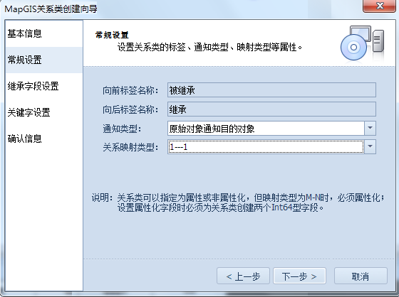 3. 关系类常规设置。在“关系类创建向导”的“常规属性”页面上设置通知类型、关系映射类型信息,完成常规属性设置,单击“下一步”。