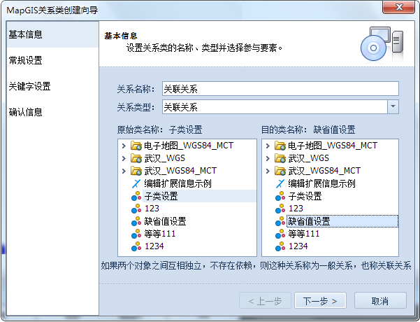 2. 关系类基本信息设置。在“关系类创建向导”的“基本信息”页面上填写关系名称,并选择关系类型为“关联关系”。在原始类列表和目标类列表中选择相互关联的原始类和目标类。系统将在目的数据中创建外键来与原始数据进行关联。完成设置,单击“下一步”。