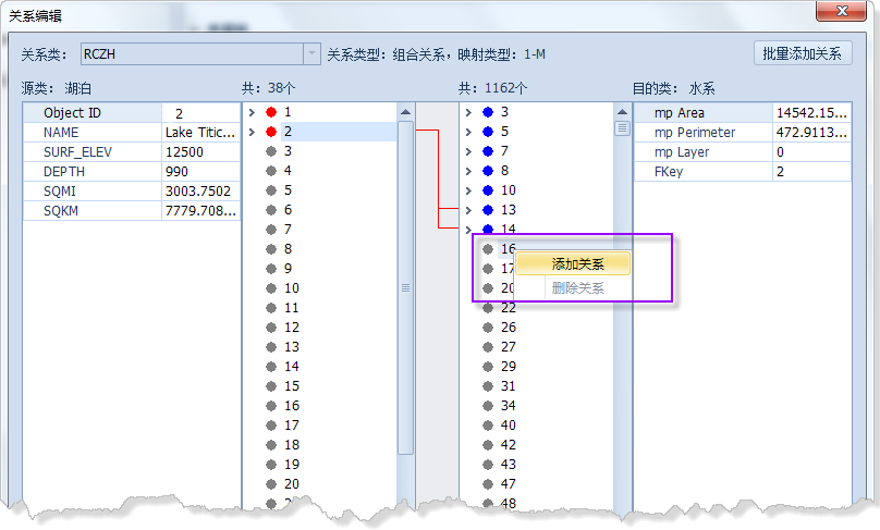 2. 进行原始类和目的类的关系编辑。在关系源类中选中一个对象ID,在关系目的类中选中一个对象ID,然后点击右键,可以添加关系,或者对已经存在的关系删除。