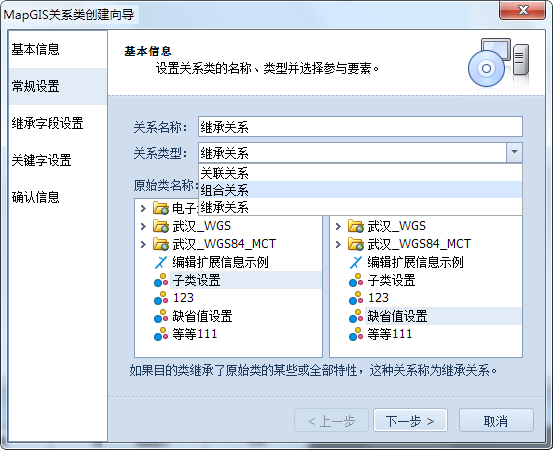 创建关系类是对关系进行操作管理的第一步。MapGIS 10中提供可创建的关系有三种:关联关系、组合关系、继承关系。