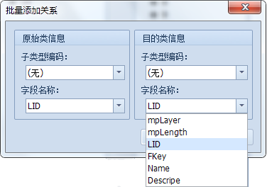 3. 点击【批量添加关系】按钮,弹出批量操作窗口(如下图)。你需要在对话框中选择原始类和目的类建立关系的连接字段,若字段下包含子类型,还可以选择相应的子类型的编码进行连接。