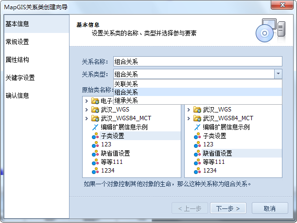 2. 关系类基本信息设置。在“关系类创建向导”的“基本信息”页面上填写关系名称选择关系类型为“组合关系”。在原始类列表和目标类列表中选择相互关联的原始类和目标类。应该注意的是,目标类会被“组合”到原始类上。完成设置,单击“下一步”。