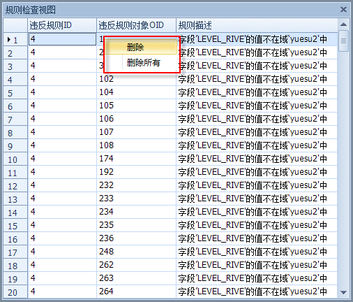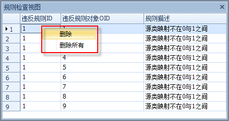 同样的,在规则检查视图上,您不仅可以查看到违反规则对象的ID号,还可以通过右键菜单,选择删除违反规则的对象。但是,需要注意的是,删除违反规则的项会删除要素的对应空间图形信息,且不可恢复。因此,执行删除操作需慎重。