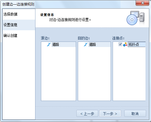 3. 在创建向导的“设置信息”页面上,选择要创建规则的源边、目的边以及连接点,完成设置,单击“下一步”。
