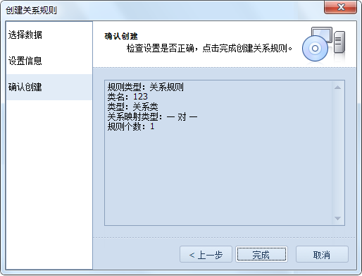 4. 在“确认创建”对话框中,检查规则设置是否正确。确认创建信息正确无误,单击"完成"执行关系规则的创建。