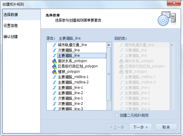 2. 在创建向导的“选择数据”页面上,选择要创建规则的类。若要对两个不同的类进行拓扑规则创建,则勾选“创建二元拓扑规则”,选择两个要素类进行拓扑规则的创建,完成选择,单击“下一步”。