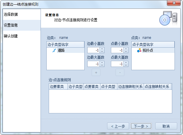 4. 在“设置信息”页上,添加边类和点类的映射关系。用户通过设置边或点的最小/最大基数,来确定各自的映射关系。类基数含义为:
