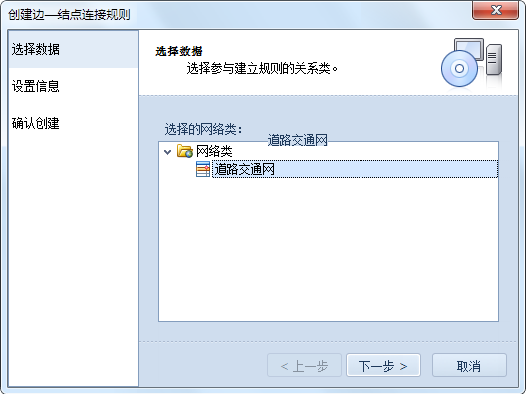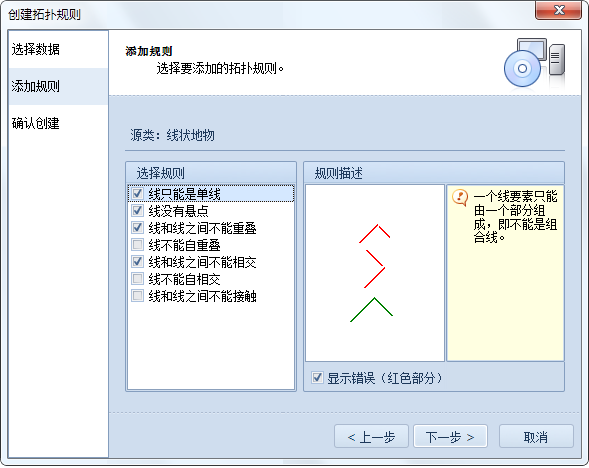 由于线要素只有两个端点,所以点类的基数最大为2。另外,只有设置的类基数合法时,添加规则的按钮“”才会被激活,点击按钮,可以将对应的类和规则添加到“边-点连接规则”列表中。完成规则的添加,点击"下一步"。