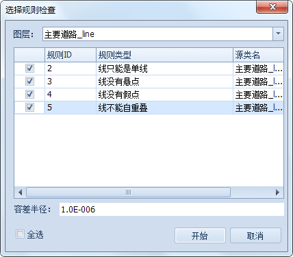 4. 在“规则检查”对话框中,显示的是该类创建的所有拓扑规则。选择需要检查的规则,然后点击“开始”,开始对指定拓扑规则的检查。
