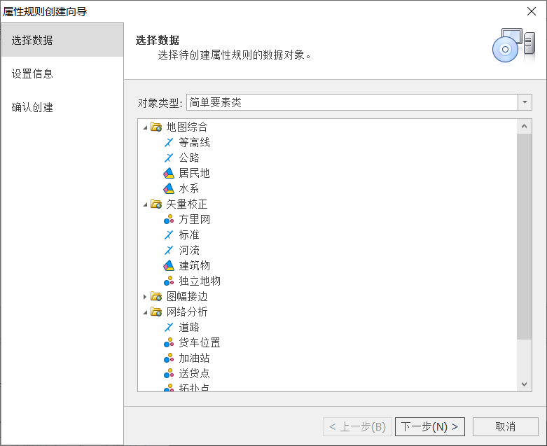 2. 在属性规则创建向导“选择数据”页中选择对象类型,用户可选的对象类型包括:简单要素类、注记类、对象类;在页面的对象列表中,选定要创建规则的类,然后单击“下一步”。
