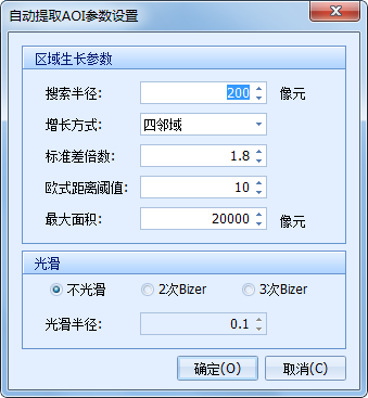 - 【光滑】:自动添加区时,可通过该参数控制是否对生成的区边界进行光滑处理。系统提供不光滑、2次Bizer和3次Bizer三种方式设置边界的光滑参数,光滑半径越小,则自动提取的AOI区边界越光滑;