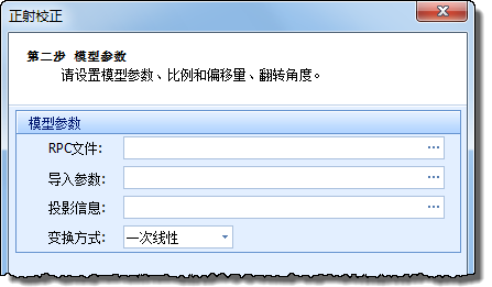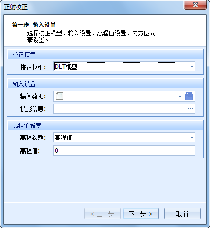 1. 选择“影像分析”菜单下的“几何校正”→“正射校正”,弹出正射校正对话框。点击“校正模型”后的下拉按钮,选择“DLT模型”,对话框显示如下:
