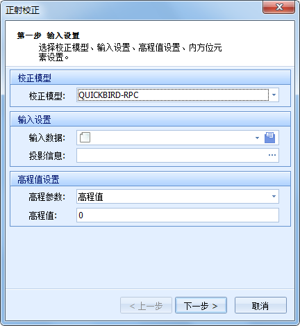 2. 在“输入数据”中加载待校正的影像数据,数据加载后,“投影信息”将自动显示源数据的投影信息,用户可点击按钮进行修改,这里的“投影信息”必须“输入数据”的投影信息保持一致;