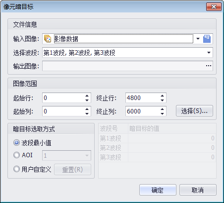 - 【暗目标选取方式】:系统提供了三种校正方式:波段最小值、AOI和用户自定义。