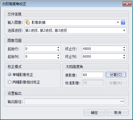 - 【图像范围】:进行太阳高度角校正处理的影像范围,用户可以直接通过输入起始行列数和终止行列数来设置图像的处理范围。