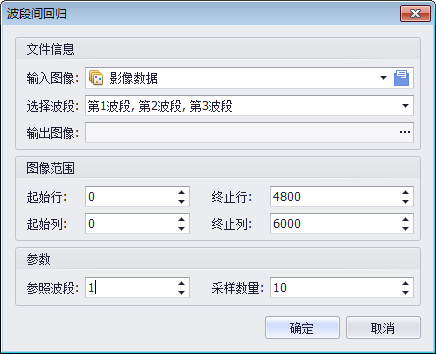- 【图像范围】:进行波段间回归分析的影像的处理范围,用户可以直接输入起始行列数和终止行列数来设置图像的处理范围。默认为输入图像的总行列数。