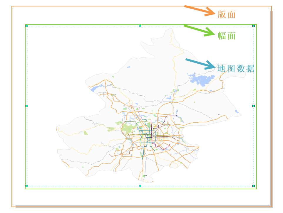 - 【幅面】:版面视图中虚线包含区域,也即数据框内部区域。幅面内包含了核心要素地图数据,可以调整幅面控制地图在版面上的显示范围与位置,一个版面中可包含多个幅面;