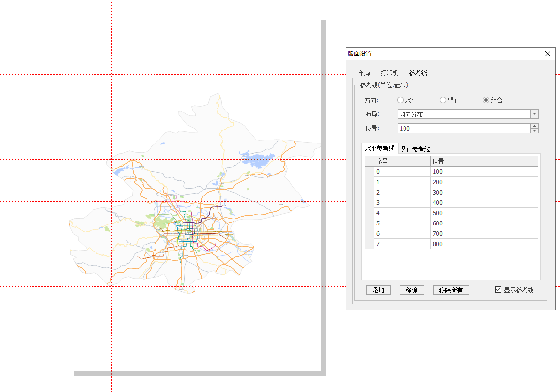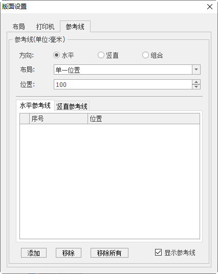- 【移除所有】:可移除水平参考线或竖直参考线列表中所有参考线数据。