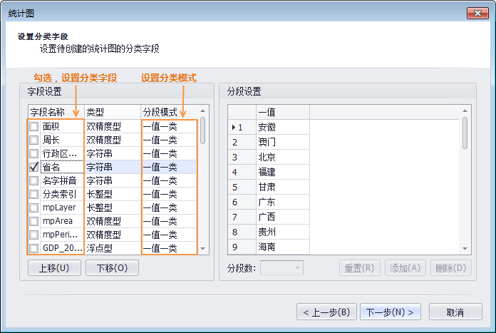 最多可以设置两个分类字段;如果分类字段类型为字符型,只支持“一值一类”的分类模式,其它字段类型还支持“分段分类”模式。